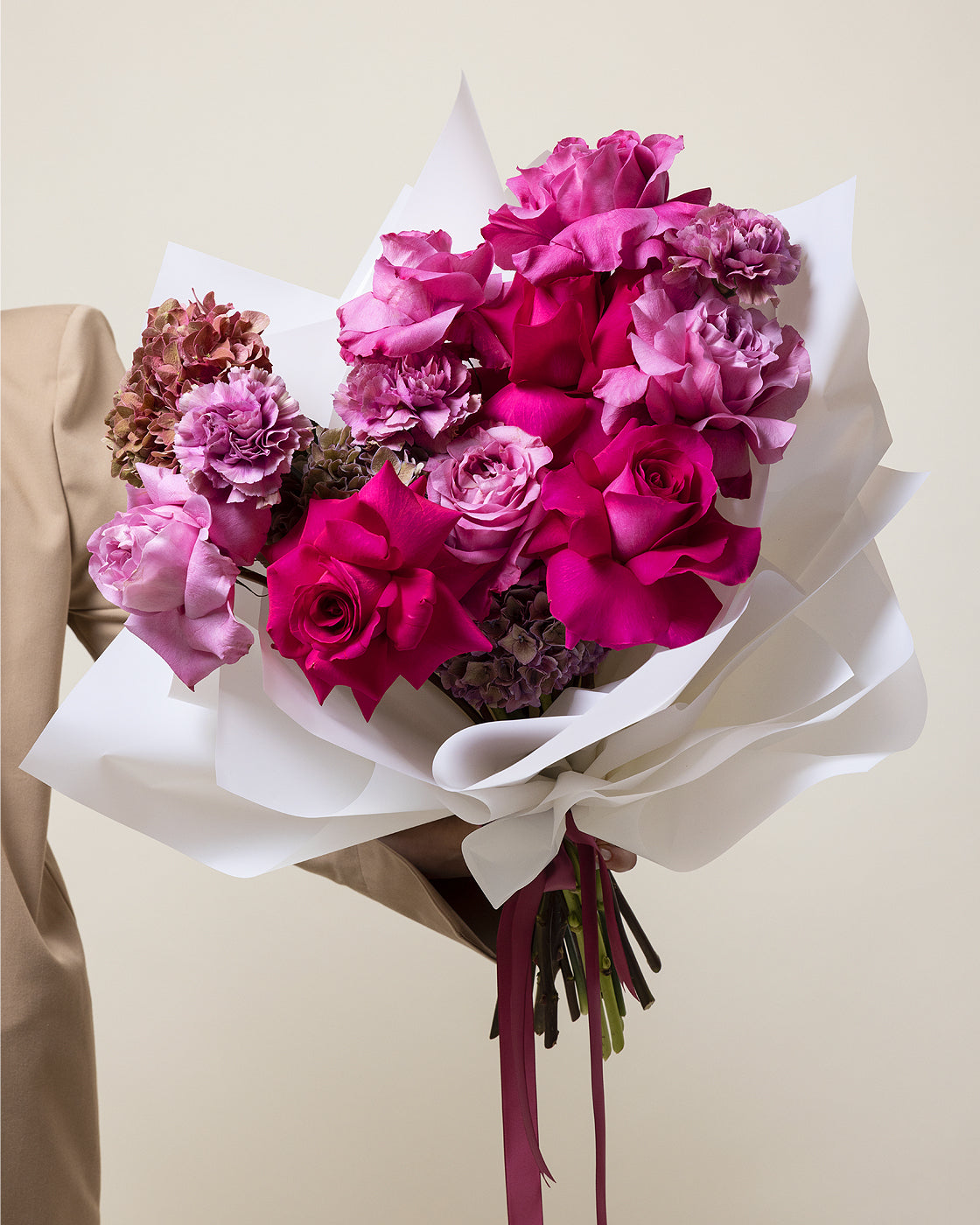 Acest buchet impresioneaza prin nuante puternice si pline de entuziasm. Trandafirii sunt simbolul dragostei, in timp ce hortensiile simbolizeaza armonia, iar garoafele adauga un element de lux si stralucire.