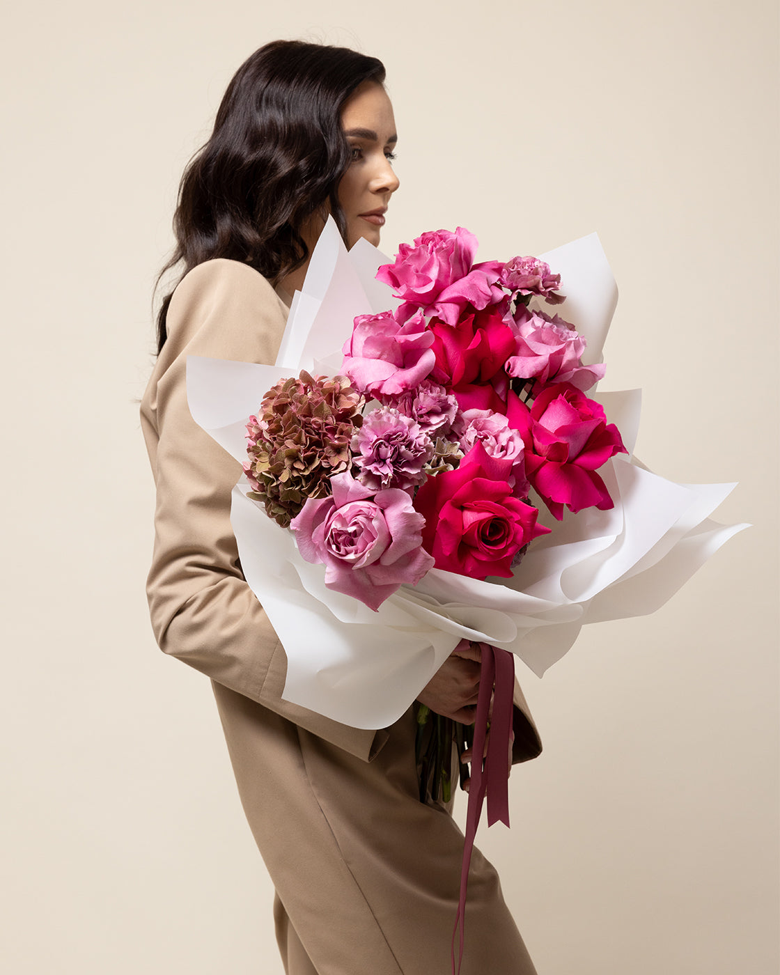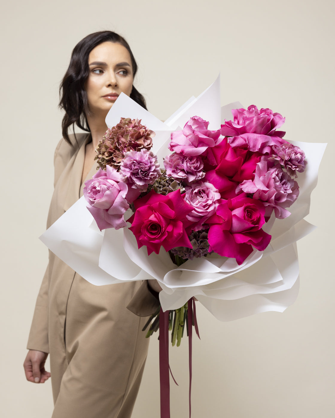 Buchetul este compus din 3 fire de hortensia roz, 9 fire de trandafir, 5 fire de garoafa 10 fire de pistachia.