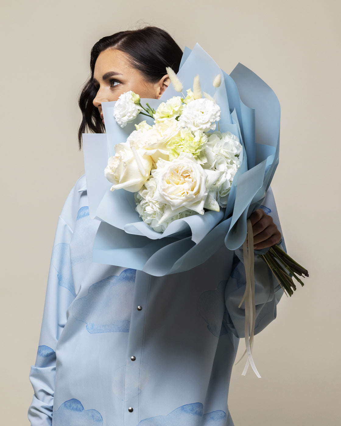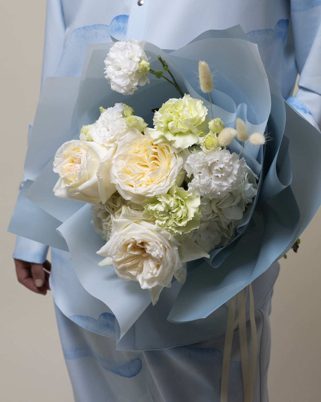 Buchetul este compus din 3 fire de trandafir alb galbui, 2 fire de hortensia alba,10 fire de pistachia, 3 fire de garoafa, 1 fir de eustoma.