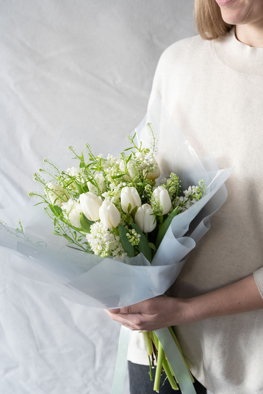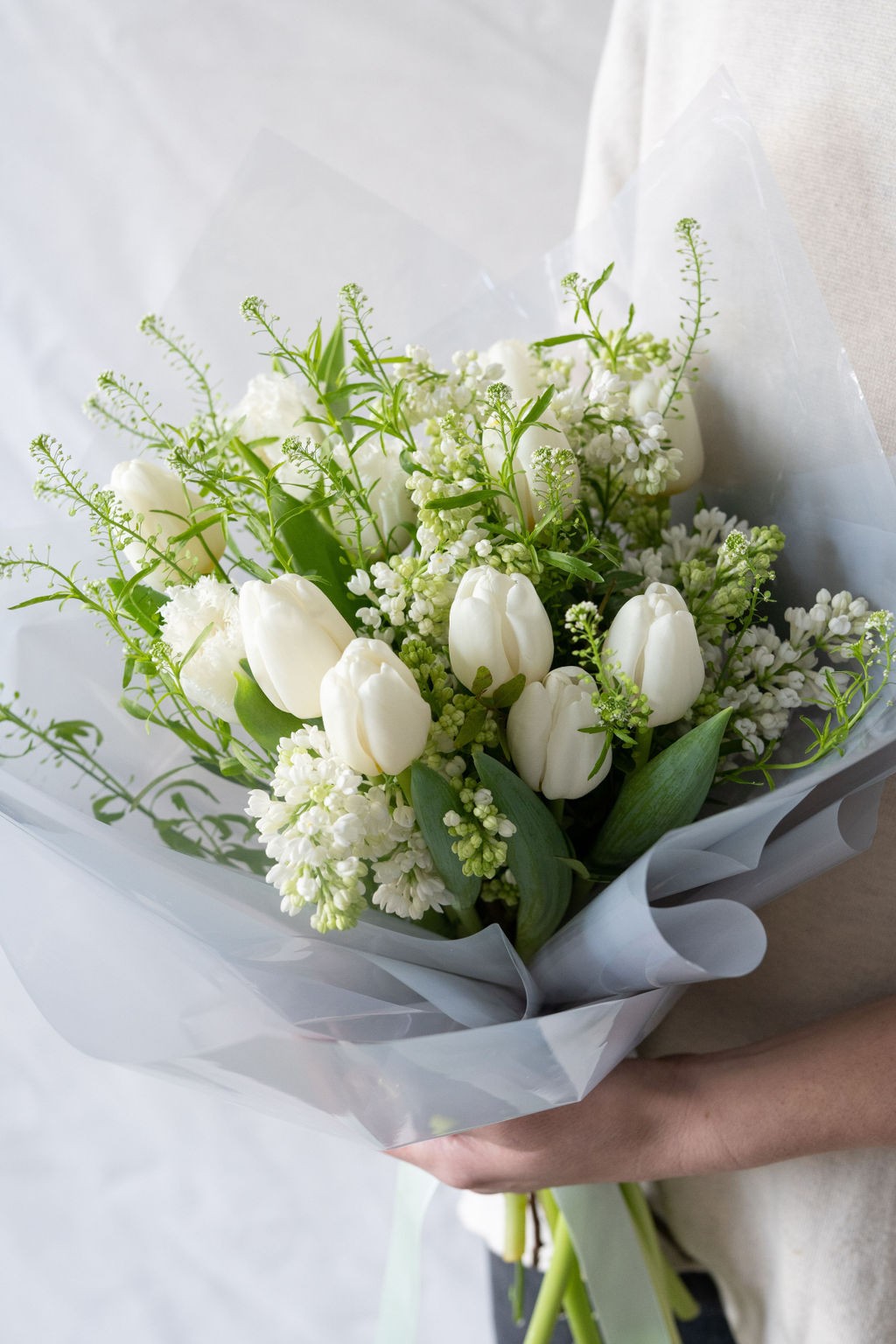 Buchetul conţine 15 lfire de alele albe, 6 fire de frezia, 2 fire de thlaspi.
