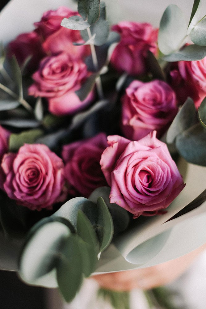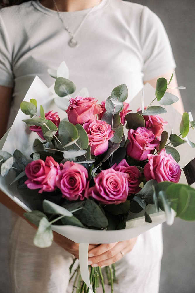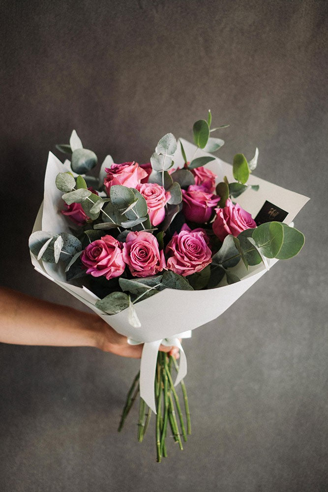 Buchetul este compus din 11 trandafiri roz si eucalipt