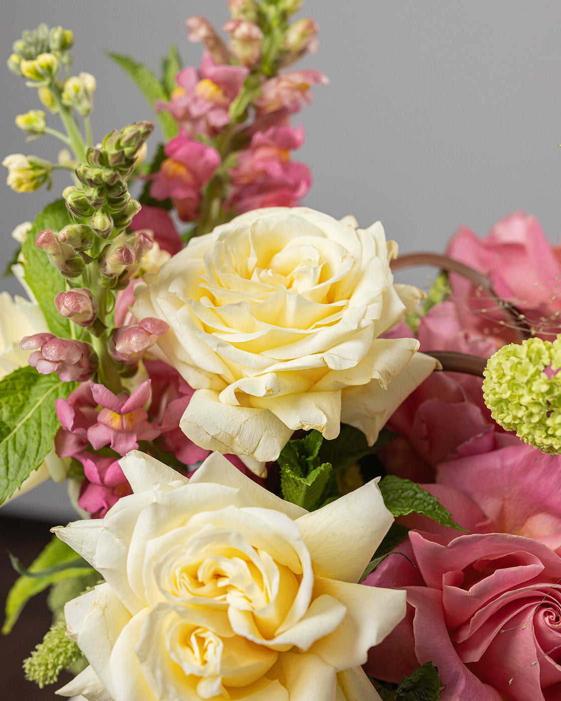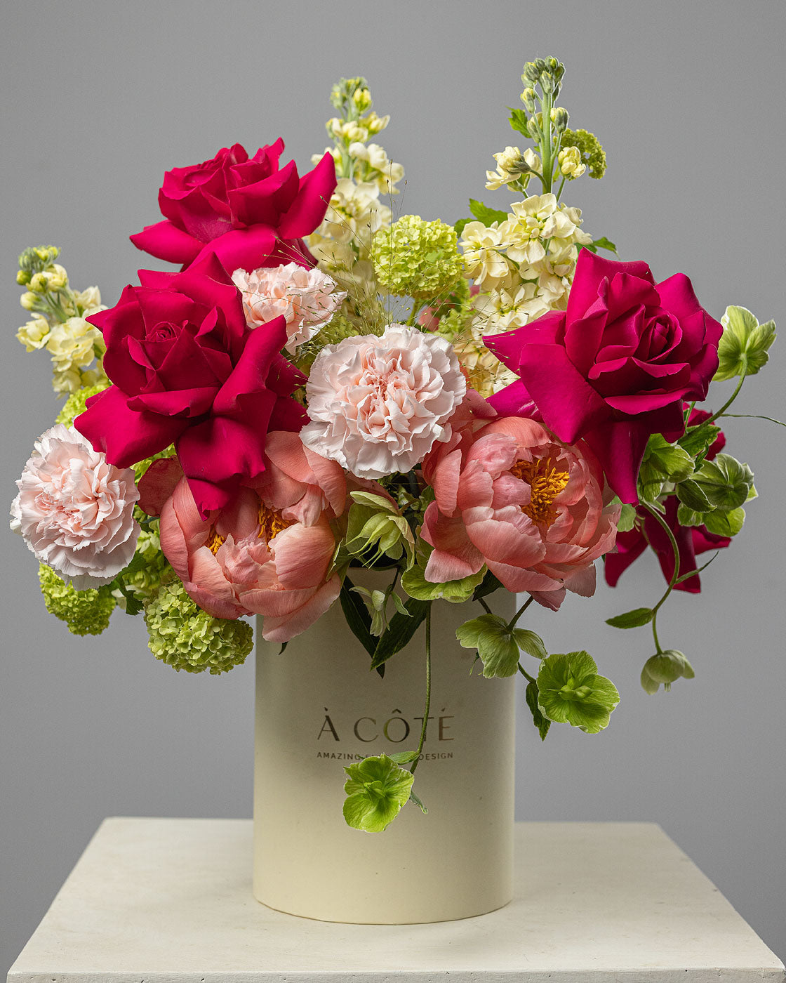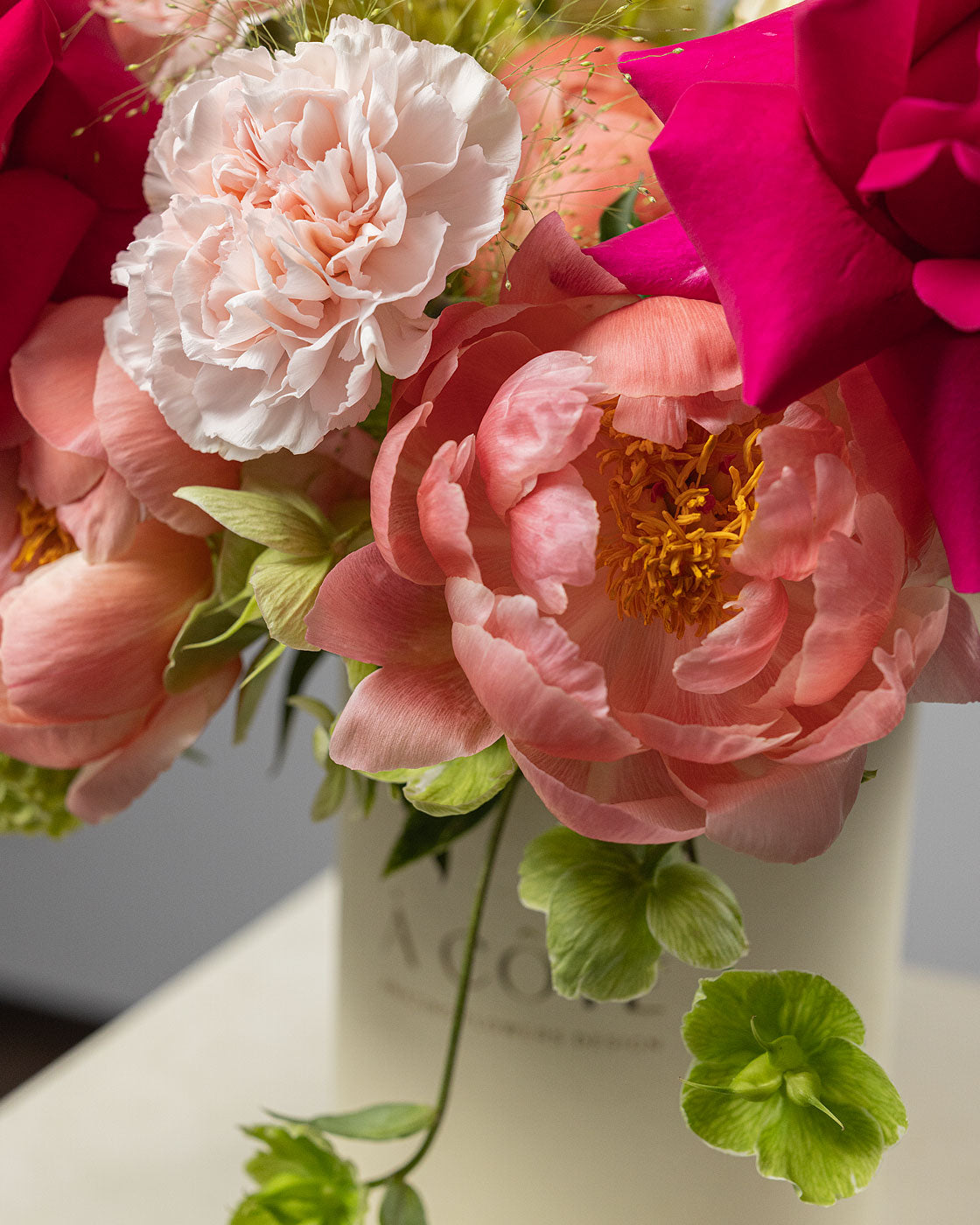 Acest aranjament floral este o capodoperă vibrantă, care îmbină nuanțele luxoase ale hortensiei verzi, delicatețea viburnumului, farmecul bujorilor Coral Charm și intensitatea trandafirilor fucsia. Hortensia verde, cu florile sale bogate și voluminoase, oferă o bază vibrantă, plină de prospețime. Viburnumul, cu florile sale delicate și nuanțele de alb-crem, adaugă un contrast subtil, evidențiind frumusețea celorlalte flori.