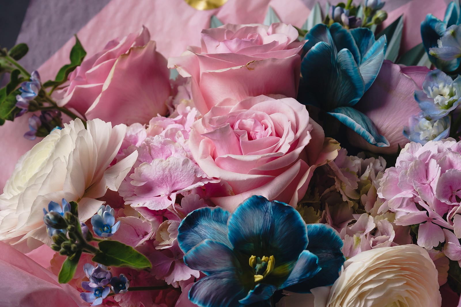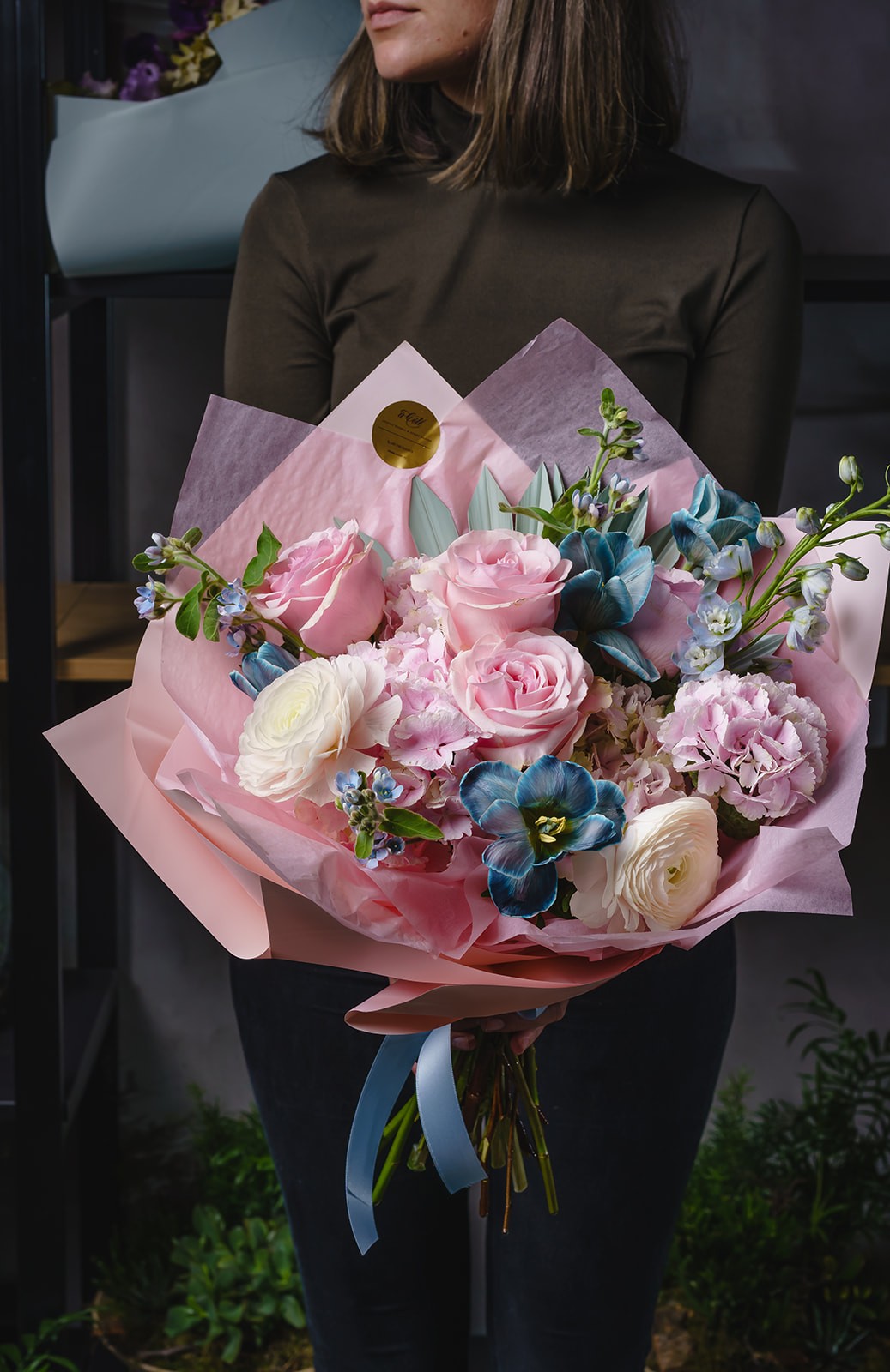 Buchetul conţine : 5 fire de lalea, 3 delphinium, 2 fire de hortensia, 5 fire de trandafir, 3 fire de oxypetalum, 2 fire de ranunculus, accesorii si 10 fire de pistachia