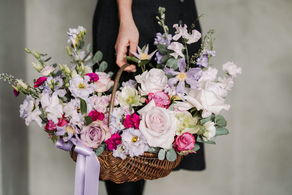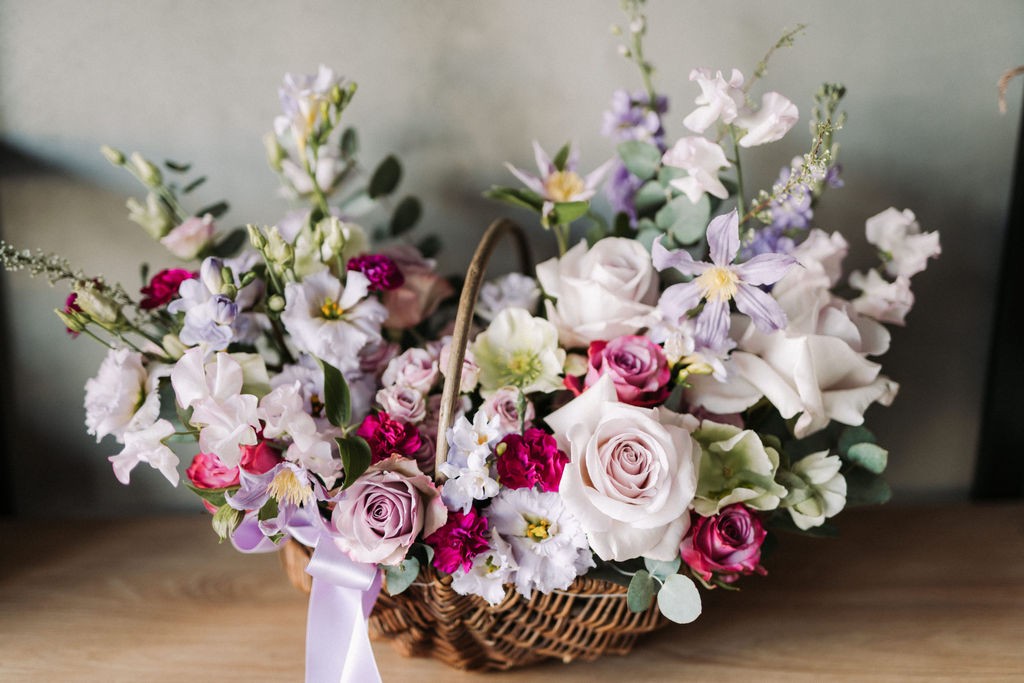 Aranjamentul floral contine: 5 trandafiri roz, 3 trandafiri lila, 2 fire miatthiola mov, 2 eustoma lila, 3 minitrandafiri, 3 lathyrus, 2 fire heleborus, 3 fire garofite, 2 fire clematis.