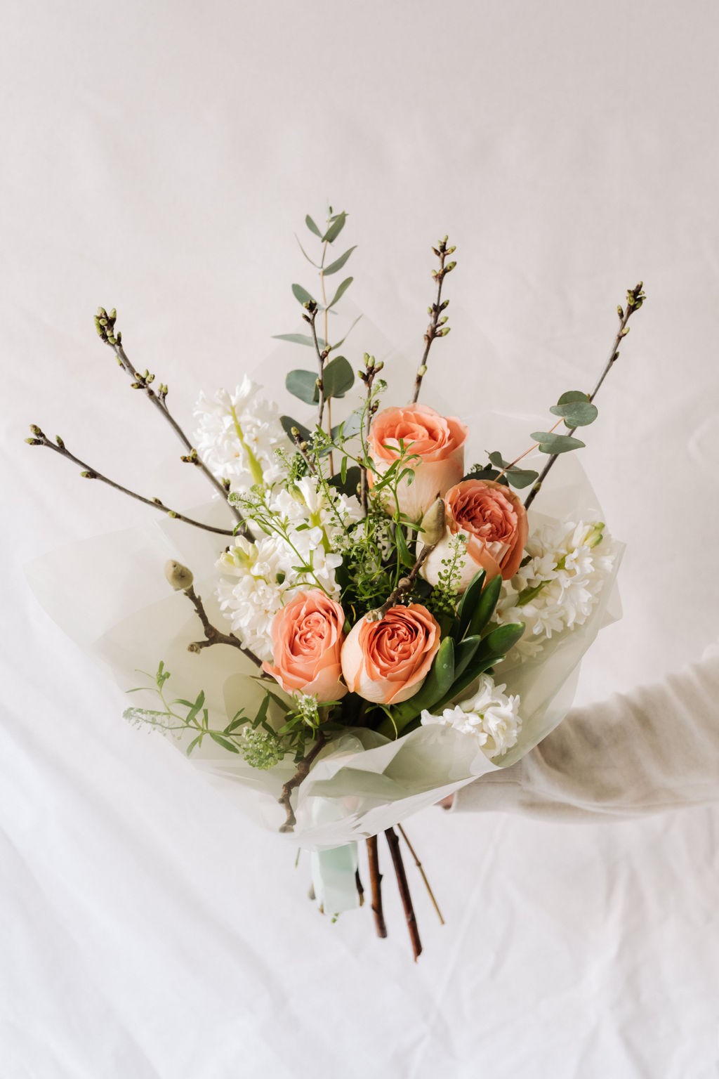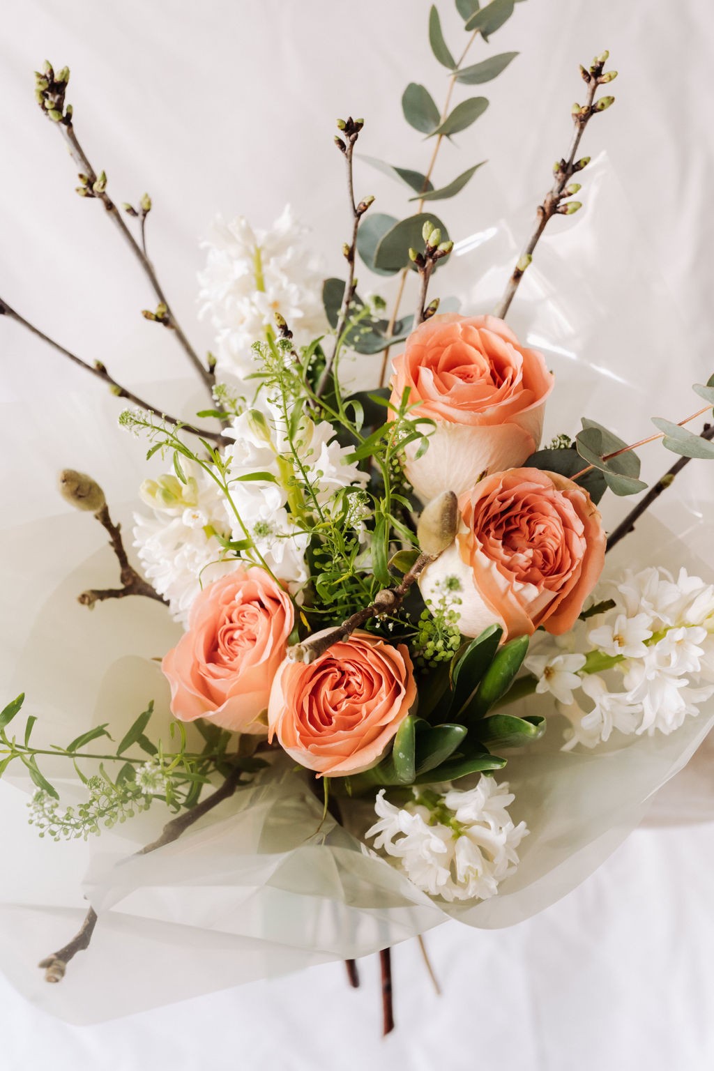 Buchetul este compus din 5 fire de trandafir portocaliu/peach, 5 fire de zambile albe, 3 fire de eucalipt, 1 fir thlaspi, 5 fire de pistachia ,2 fire crengute.