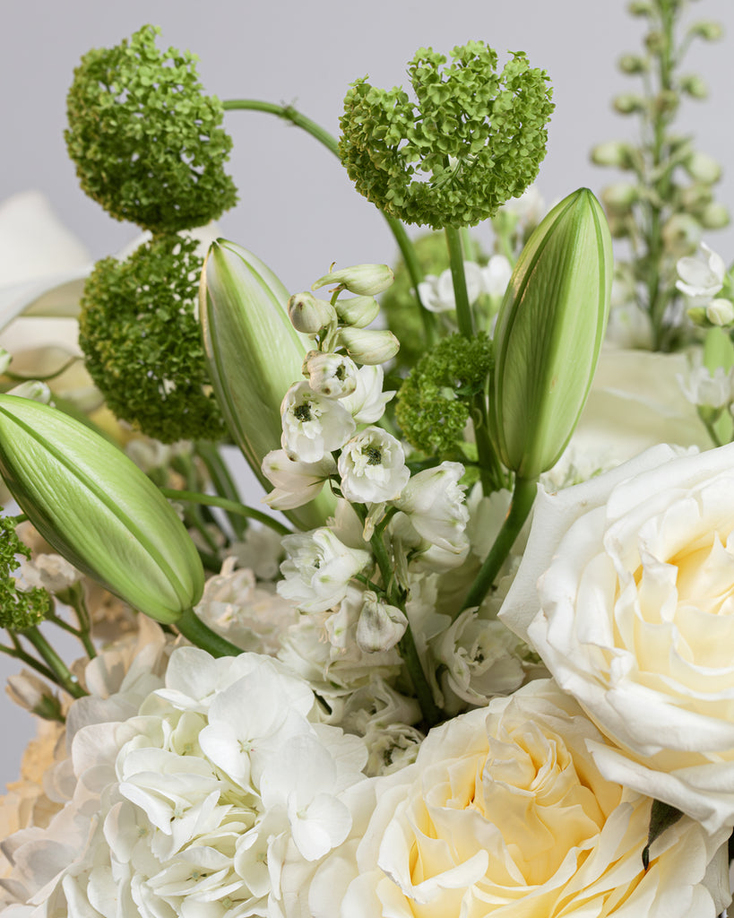 Buchetul este compus din 6 Candlelight, 3 cale albe, 5 delphinium alb, 6 oxypetalum alb, 3 crini, 5 hortensii albe, 4 viburnum.