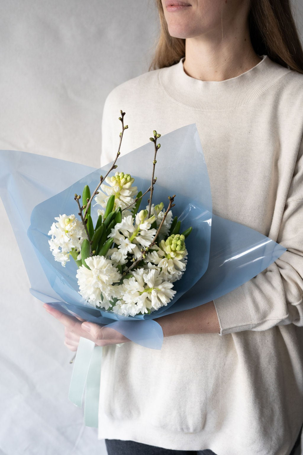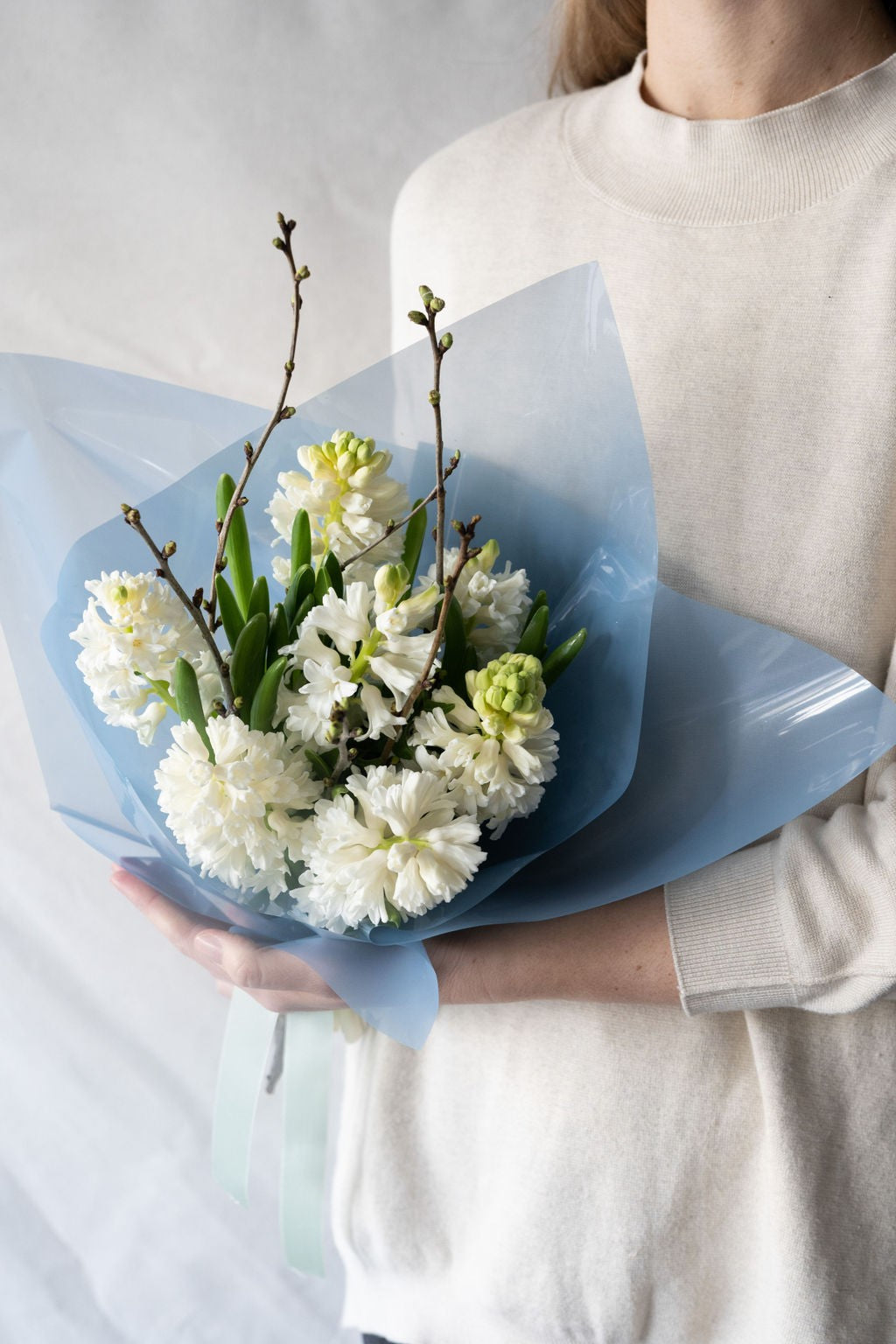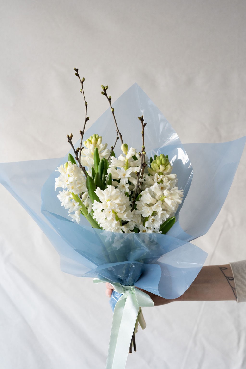 Buchetul este ambalat cu folie si accesorizat cu panglica satinata.