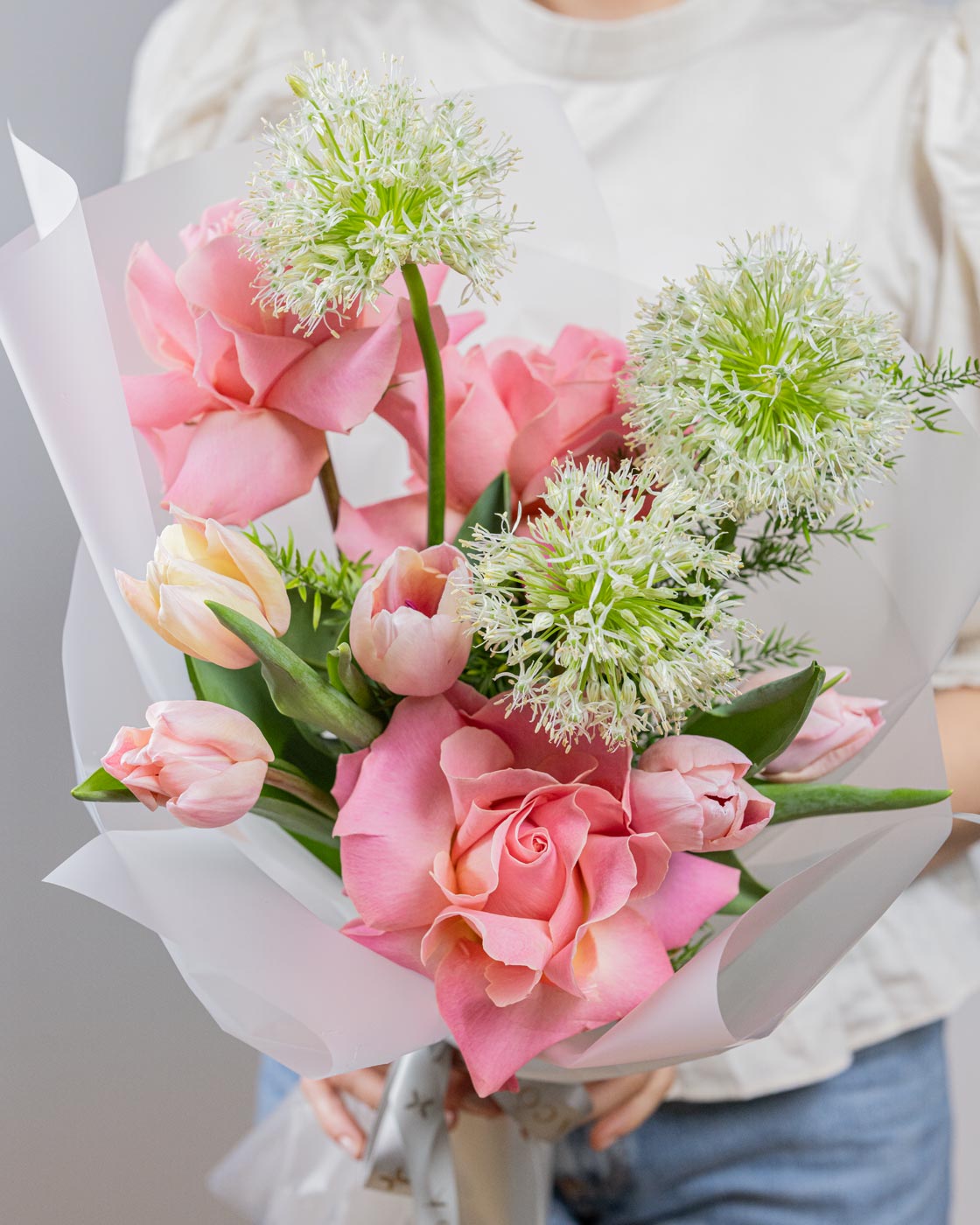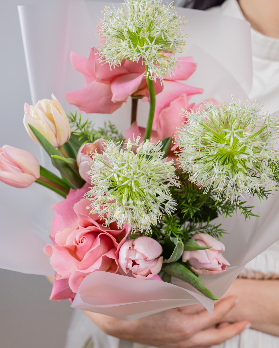 Un buchet delicat și plin de farmec, care combină trandafiri Hermosa cu lalele roz și accente de Allium alb, pentru un efect ușor aerat și elegant. Contrastul dintre forma rotundă a trandafirilor, grația lalelelor și textura sculpturală a Allium-ului creează un aranjament modern, plin de viață și sofisticat în același timp.