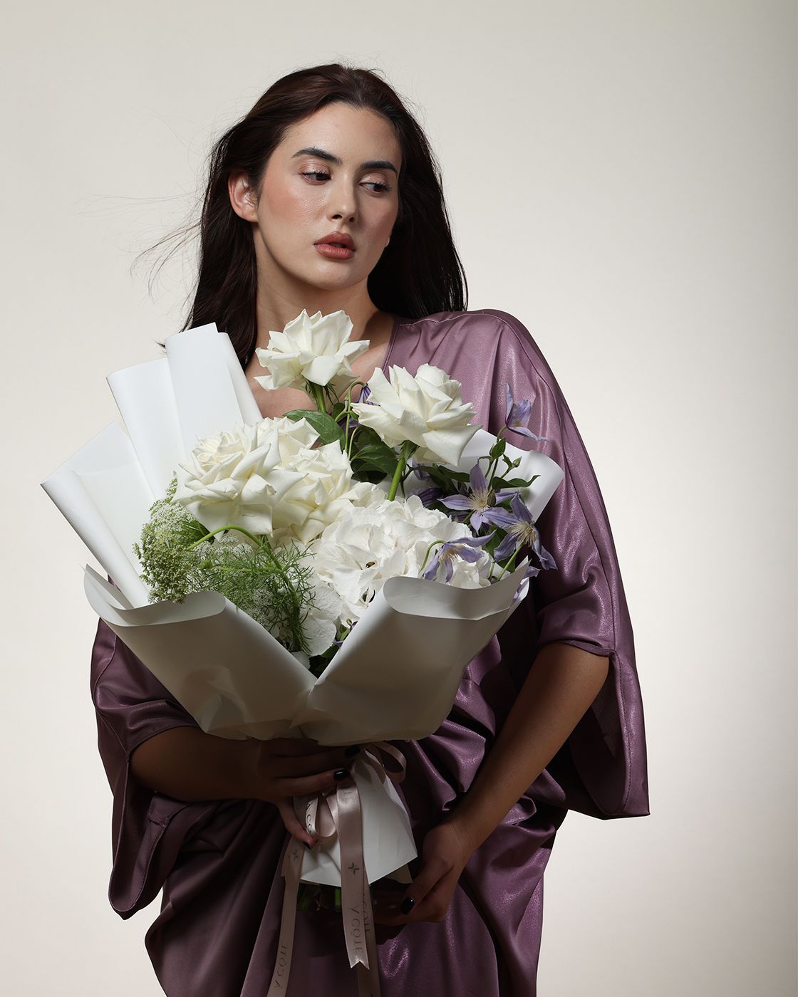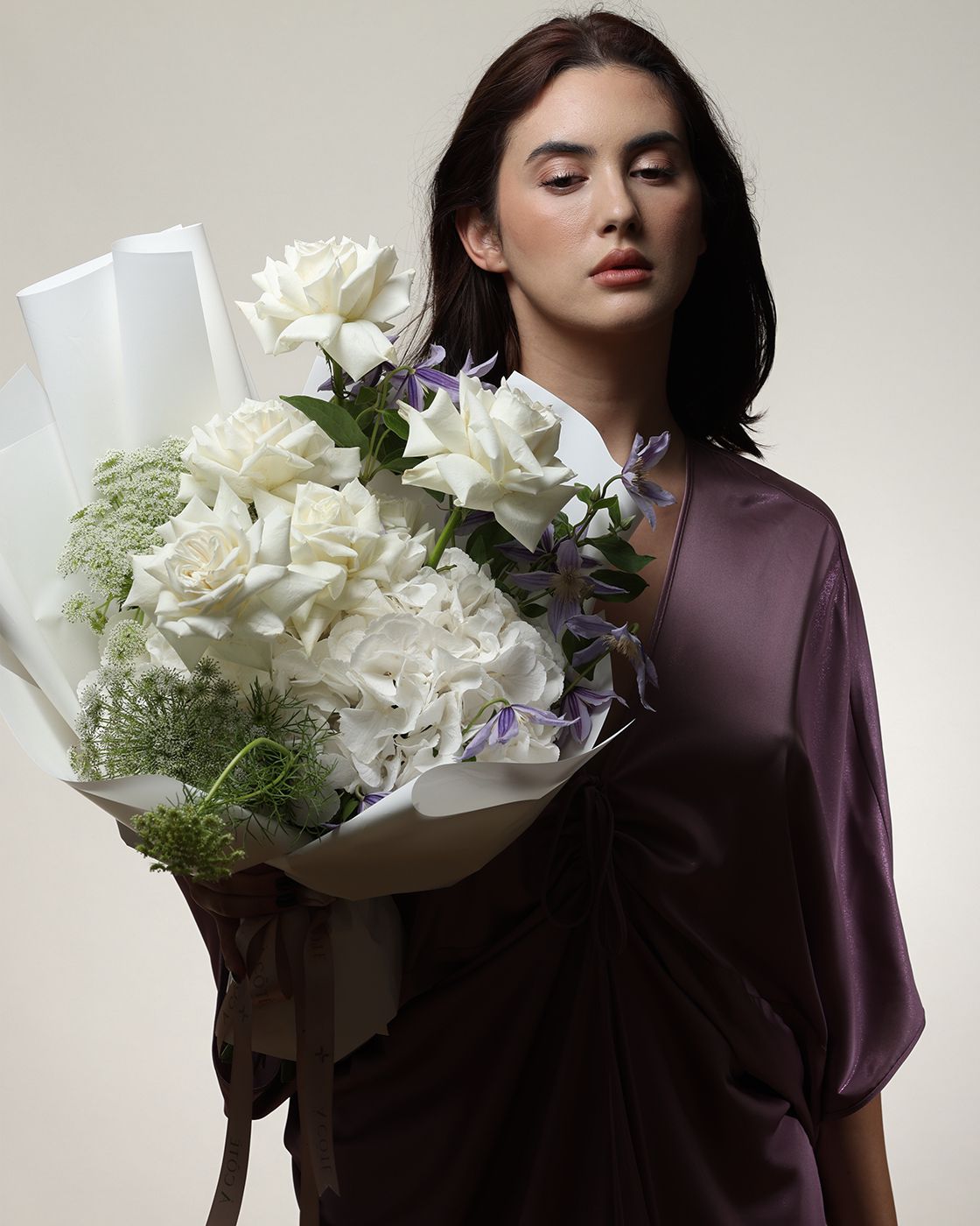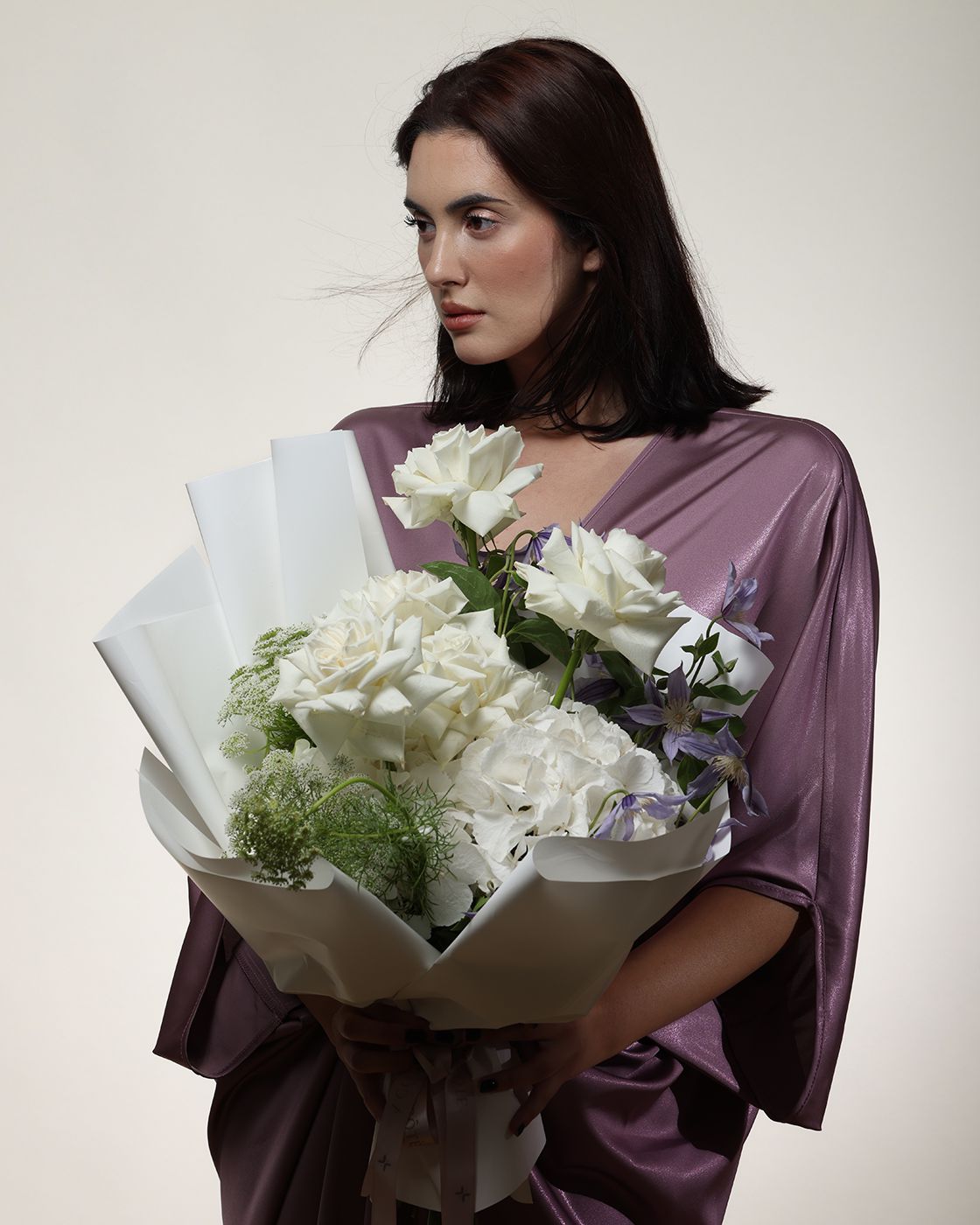Clematisul aduce un aer delicat,hortensia alba simbolizeaza puritatea, iar trandafirii albi reprezinta sinceritatea, ideal pentru nunti, aniversari sau moment de apreciere.Acest buchet este perfect pentru a transmite emotii autentice..