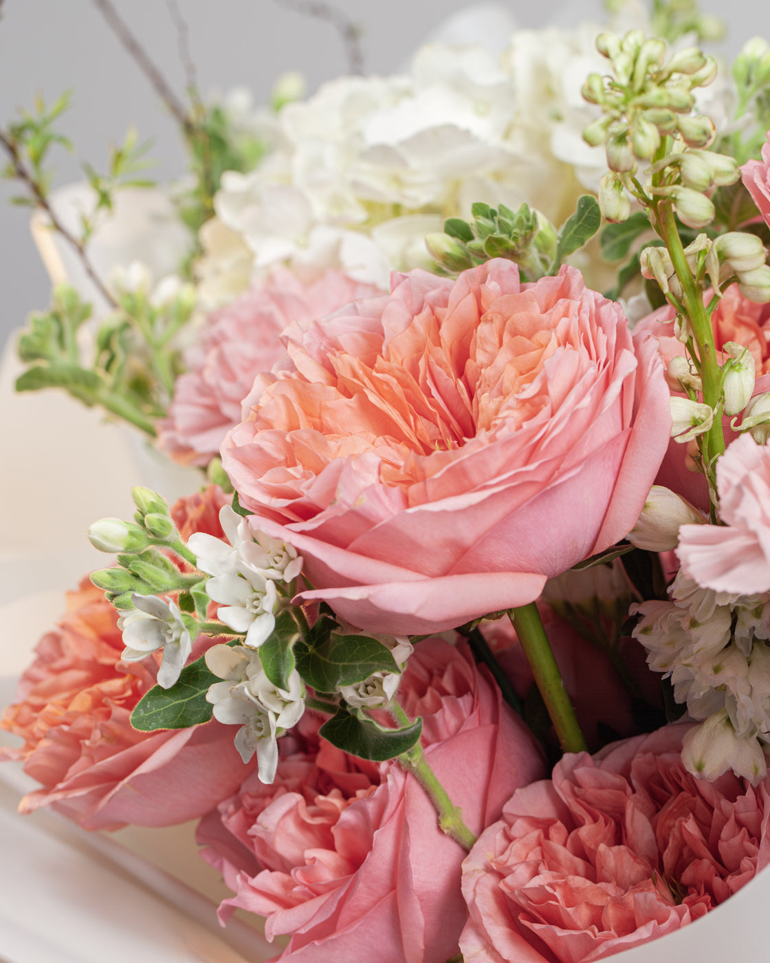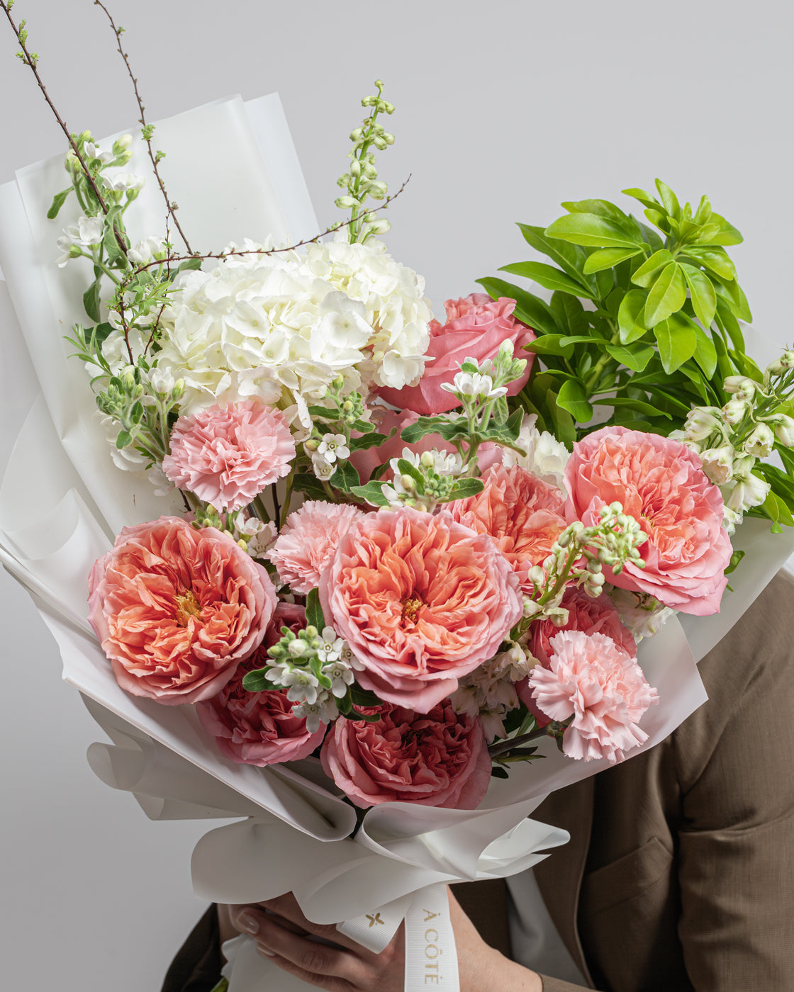 „Lune Rose” este un buchet cu aer visător, construit în jurul eleganței trandafirilor Pink Expression , îmblânzit de textura pufoasă a hortensiei albe, oxypetalum-ului delicat și accentele verzi și luminoase de choysia.