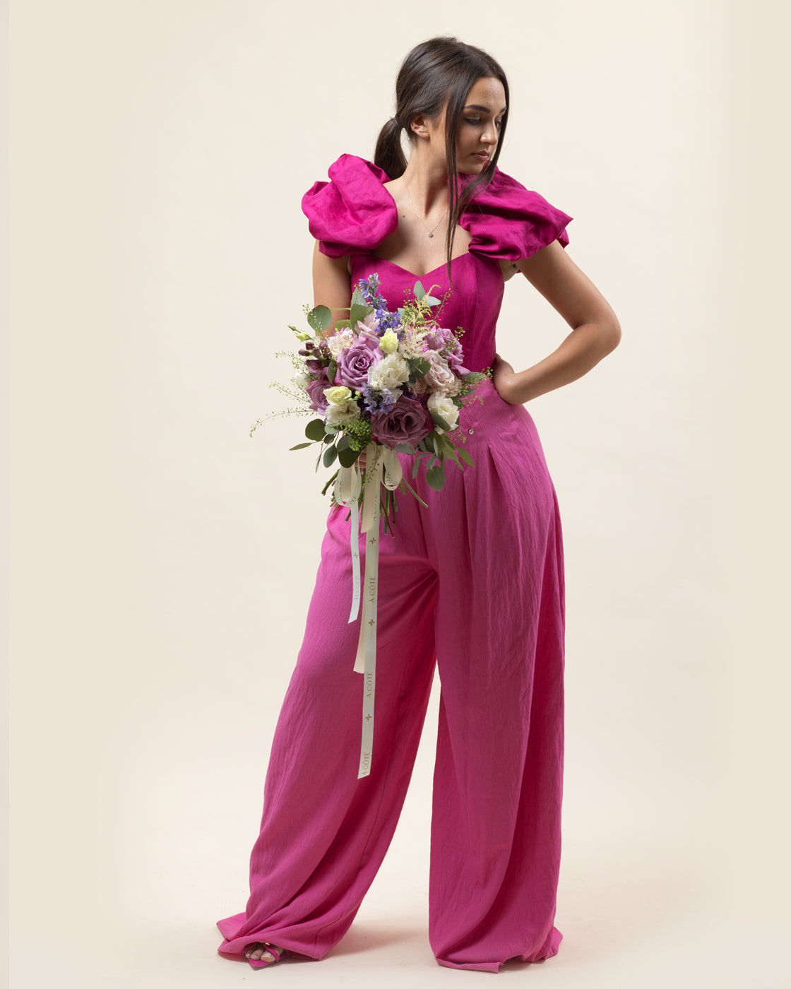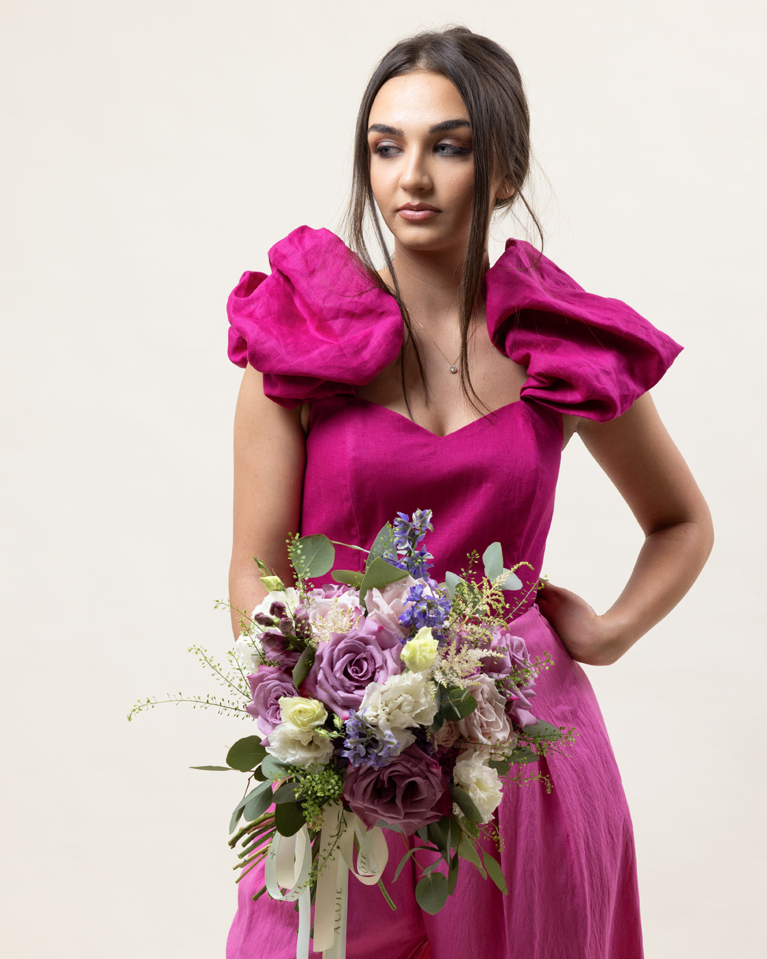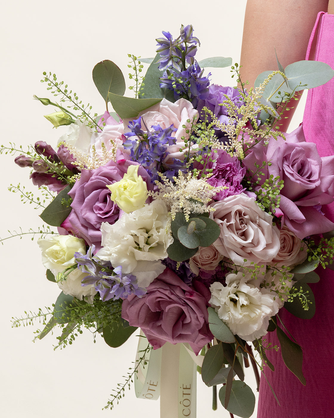 Acest buchet elegant în nuanțe de mov și lila emană o delicatețe poetică ce învăluie simțurile într-o aură de mister și rafinament. Combinând cu artă elemente naturale atent selecționate, buchetul răspândește sau armonie cromatică subtilă și tăndră.
