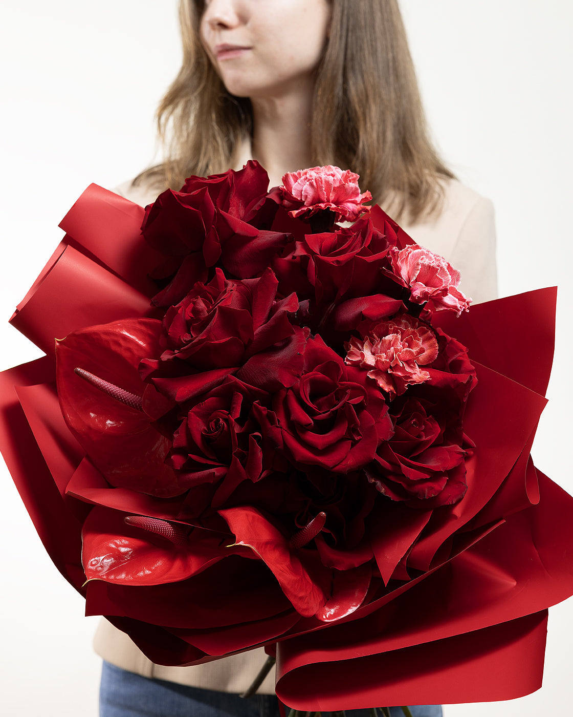 Buchetul este compus din : 3 anthurium rosu, 3 garoafe, 7 trandafiri rosii.
