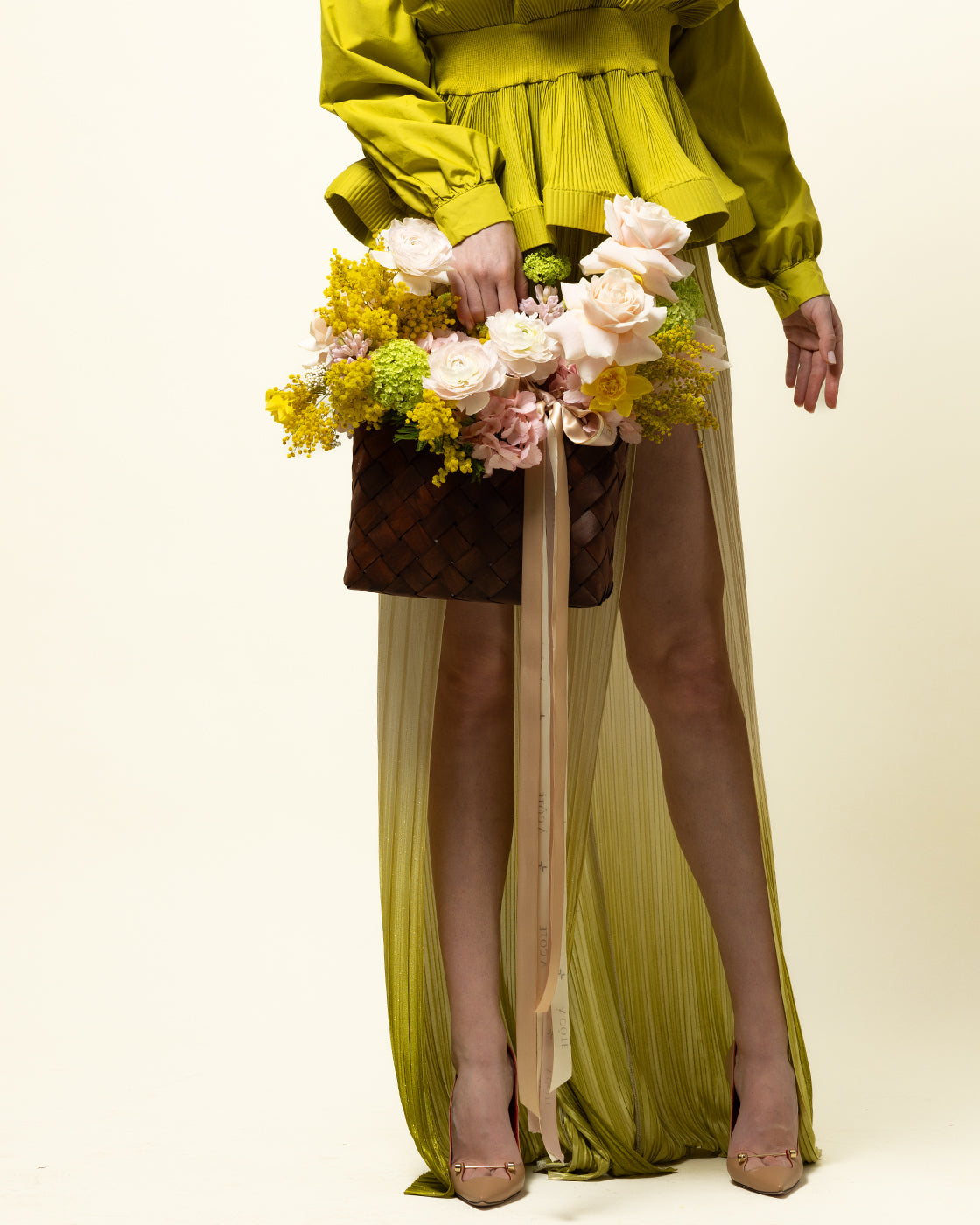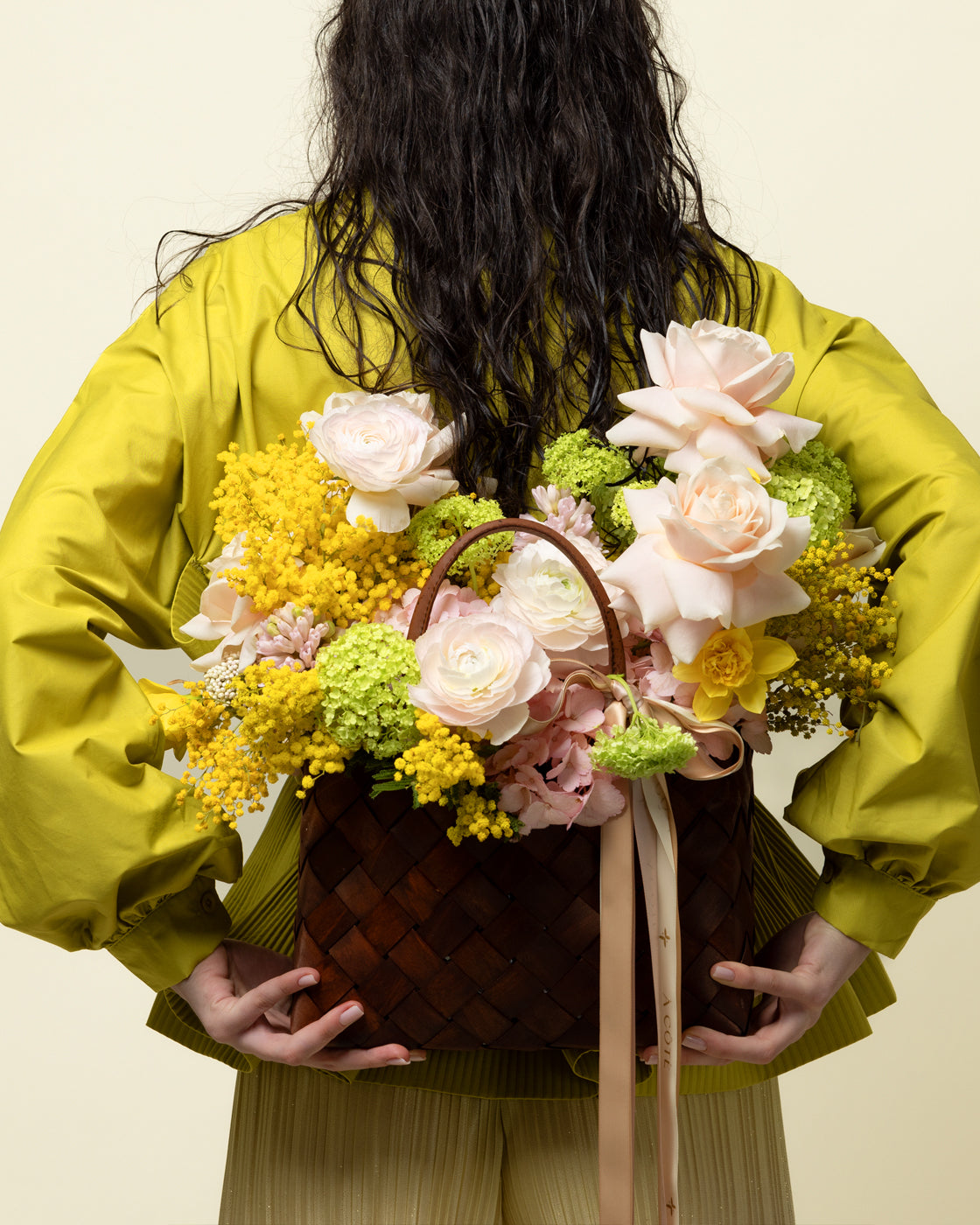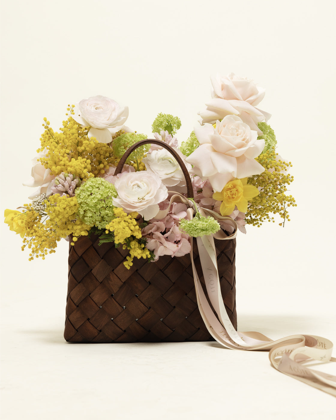 Aranjamentul floral contine: 2 hortensia roz, 2 fire mimoza, 2 viburnum, 5 trandafiri roz, 6 ranunculus, 2 zambile, 3 narcise.