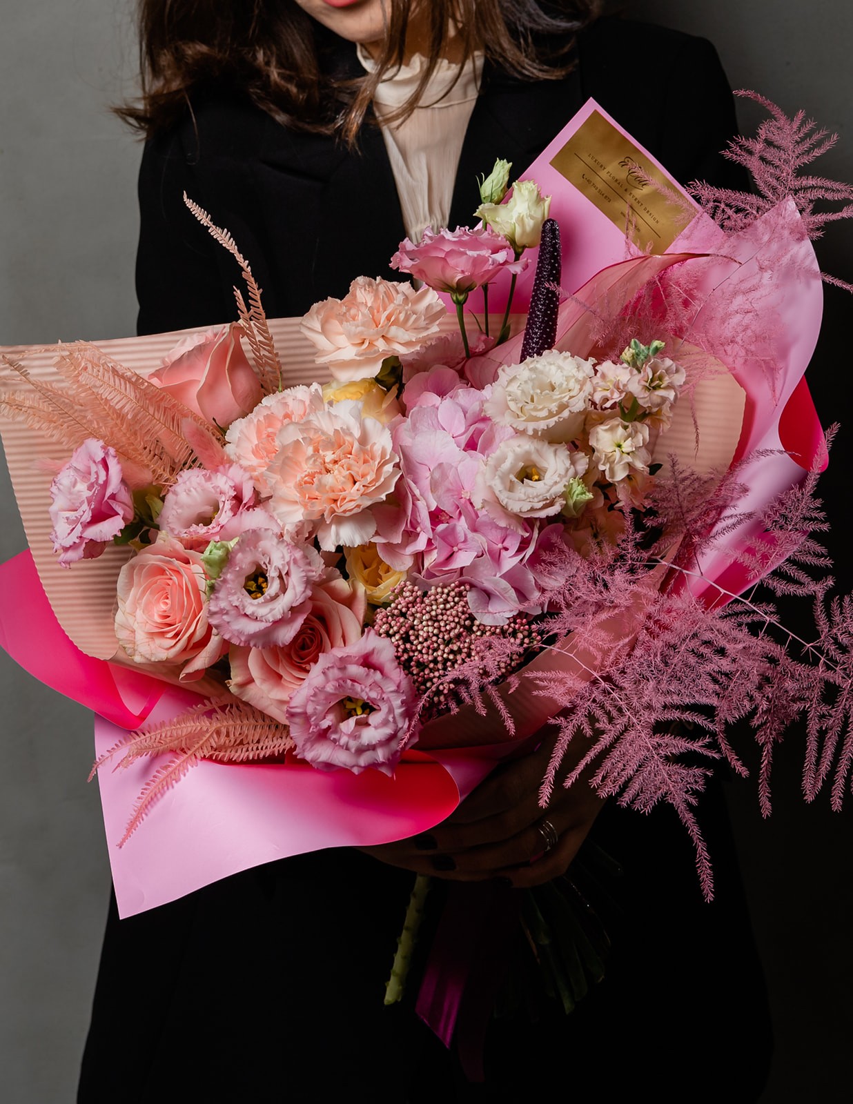 Buchetul conţine : ,2 fire de hortensia, 5 fire de trandafir, 2 fire de eustoma, 3 fire de ozothamus, 2 fire de anthurium, 3 fire de trifern criogent si 15 fire de fire de pistachia.
