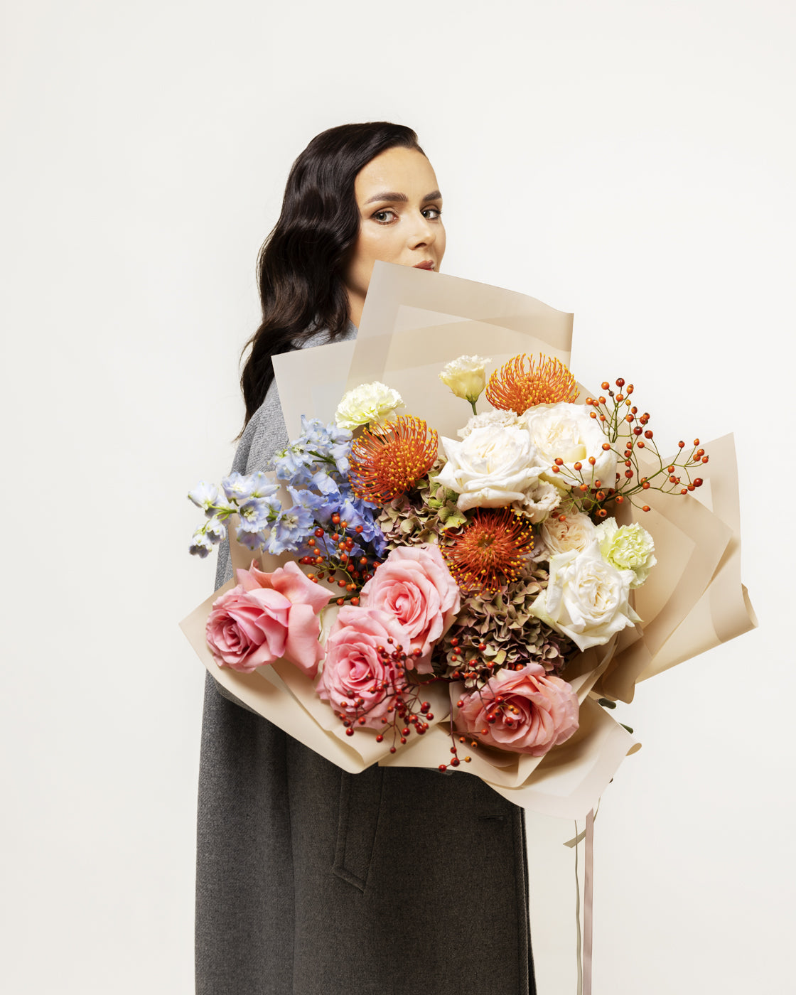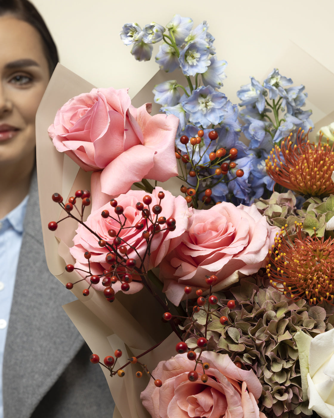 Buchetul 'Very Berry' de toamnă este o explozie de culori și texturi care aduc cu sine farmecul și căldura acestui anotimp minunat. Fiecare floare și fruct este ales cu grijă pentru a aduce în prim-plan nuanțele și atmosfera autentică a toamnei.