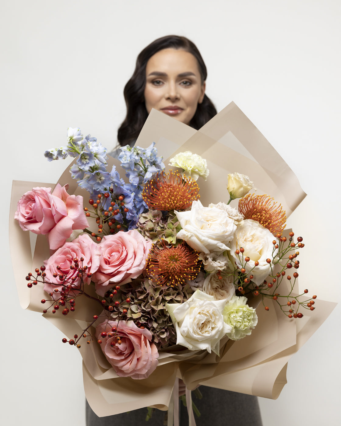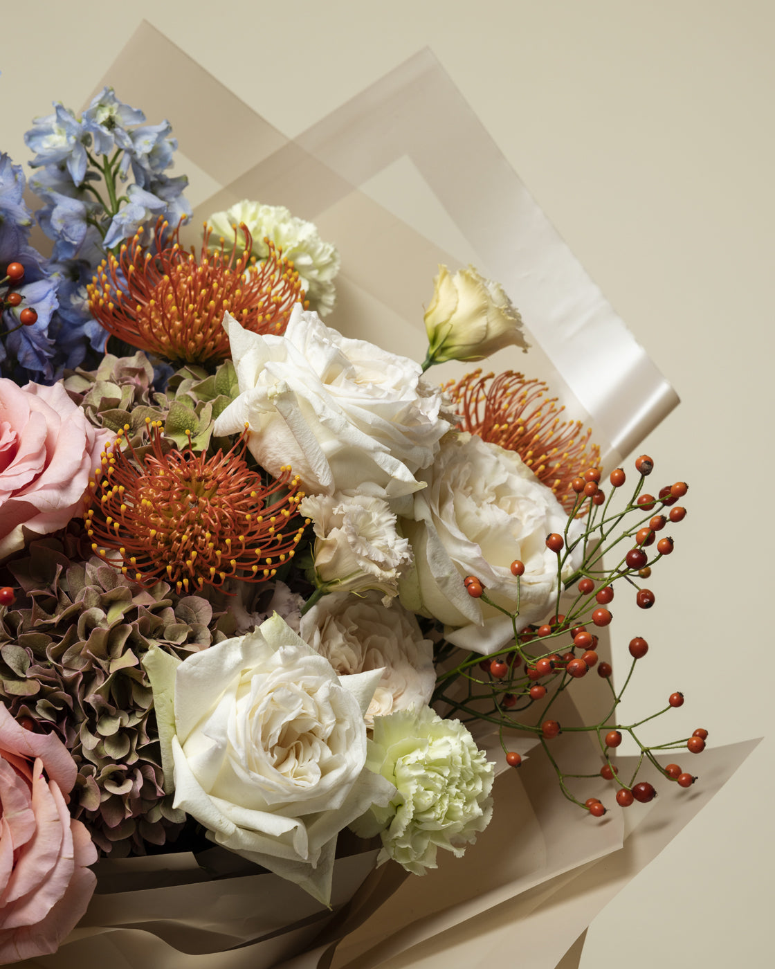 Buchetul conține : 7 fire de trandafir, 3 fire de hortensia, 3 fire de delphiunium, 3 fire de nutan, 3 fire de garoafa, 3 fire de accesorii tomnatice, 1 fire de eustoma, 15 fire de pistachia.